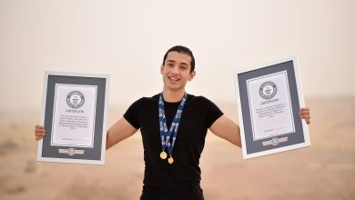 مصري يزيد حصيلته من ألقاب غينيس للأرقام القياسية بلقب جديد أمام معبد هيبس بالخارجة بمصر